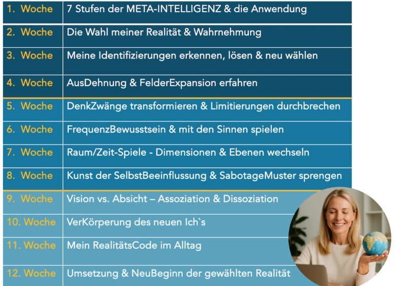 Das META INTELLIGENZ-Programm ist nicht als Fernunterricht im Sinne des Fernunterrichtsschutzgesetzes (FernUSG) zu verstehen. Es wird nichts geprüft oder zertifiziert und dient ausschließlich der Freizeitgestaltung. Alle Teilnehmer stehen in einem direkten Austausch mit dem Kursleiter.